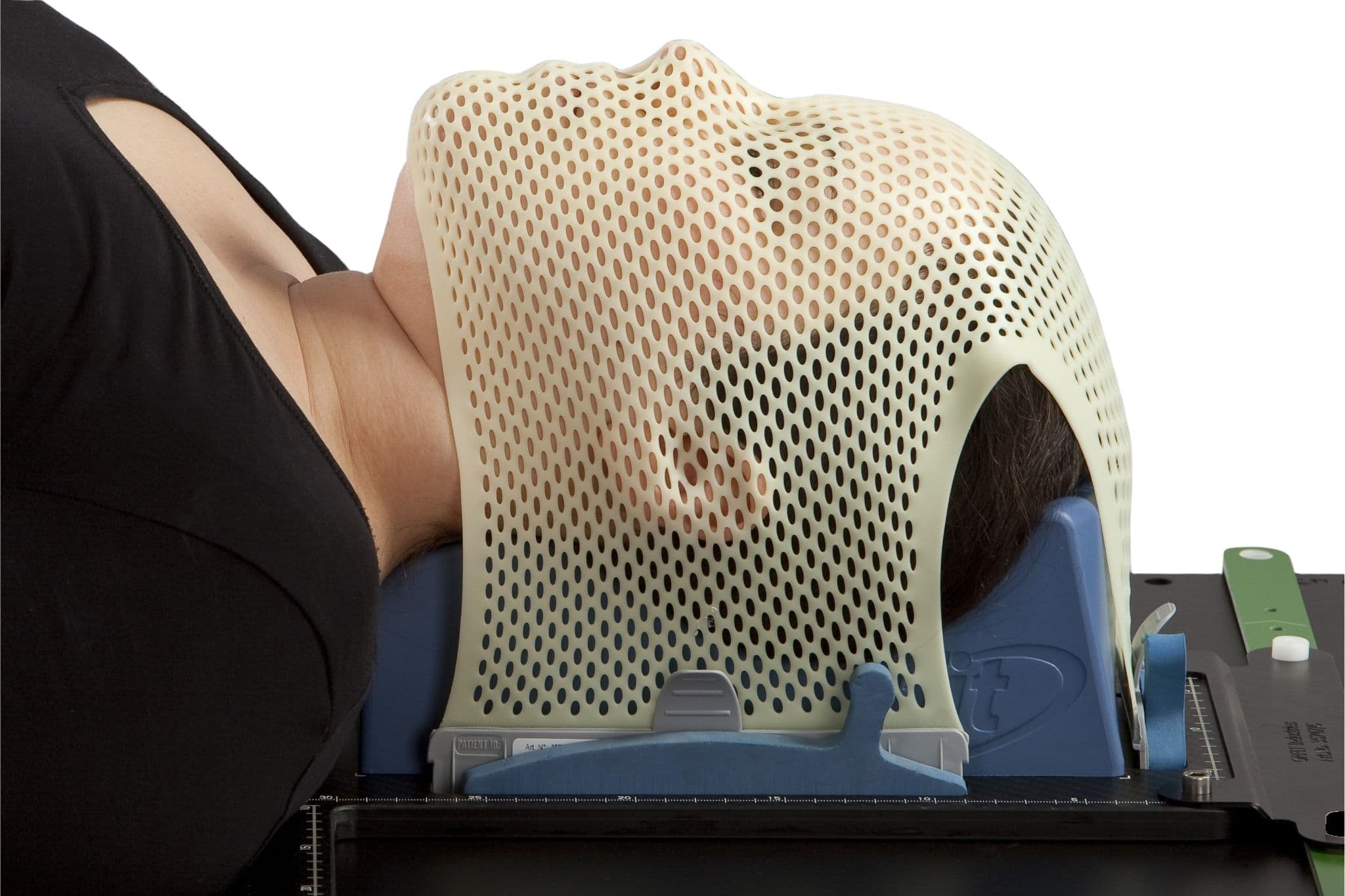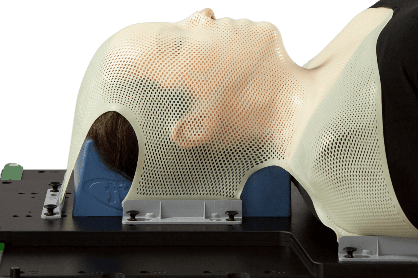 The HP immobilization is a complete system combining Efficast thermoplastic masks with unique features, innovative 3D Shaped Head Supports, and L-shaped profiles that fix the mask in the High Precision Hardware. Each element is designed to work together for maximum reproducibility and minimal motion.