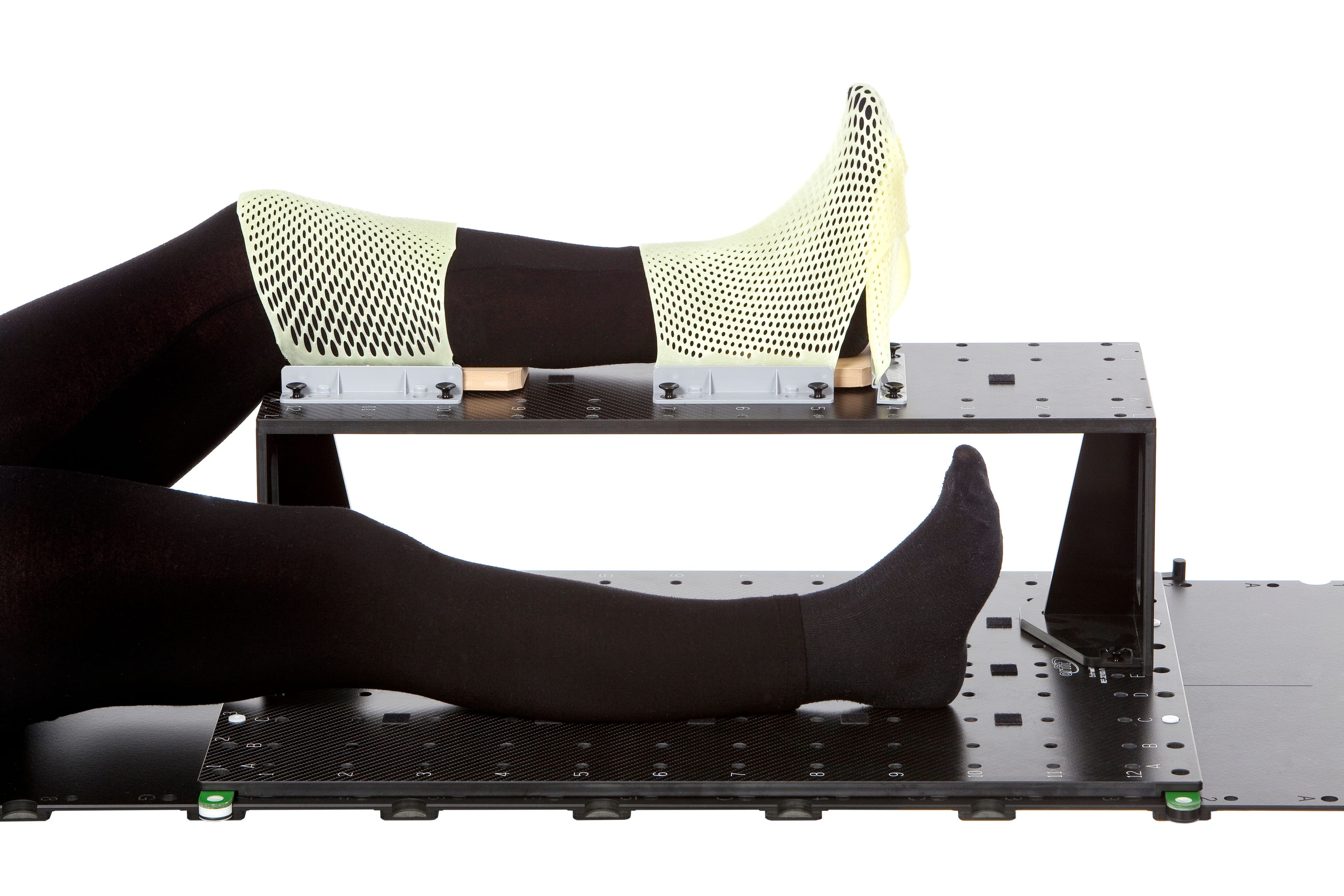 Lower extremities are positioned using a leg support that lifts one leg out of the treatment field. Foam cushions under the knee and heel increase patient comfort. Thermoplastic masks can be molded over the base plate or leg support for secure immobilization.